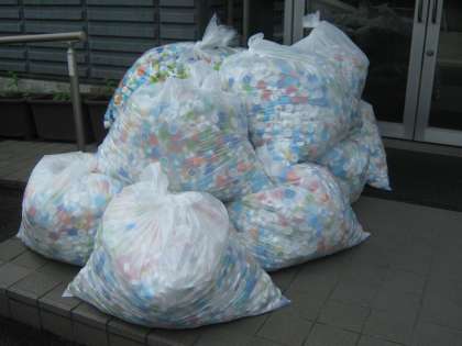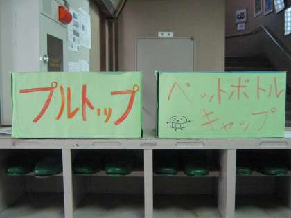 今日は,みなさんのご協力で集まったプルトップとペットボトルのキャップを,