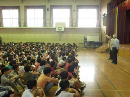 今回は南校舎の一階に,不審者が侵入したという想定で避難訓練を実施しました。教室で一次避難をした後,担任とともに体育館へ二次避難をしました。どの学年も,「おはしもて」を守って避難することができていました。
