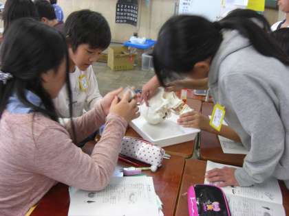 アンモナイトの化石や,ネアンデルタール人の頭蓋骨(レプリカ)なども用意してくださり,子どもたちは,わくわく,ドキドキしながら観察しました。