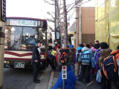 バスに乗るとき,「雪がたくさん積もっている。」と運転手さんに教えていただきました。この話を聞いた子どもたちは興奮ぎみです。景色の移り変わりにも注意して花背にむかっています。