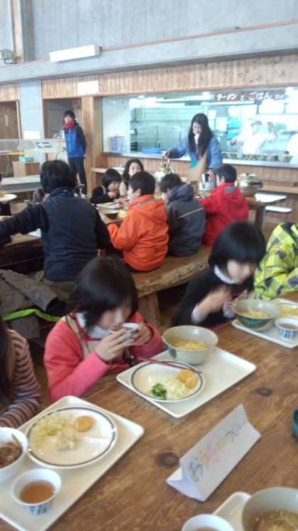 荷物をロッジに置いて,お昼ごはんを食べました。カレーライス,牛丼,ラーメンから一つを選んでいただきます。屋根からは一メートルものつららが下がっているのに子どもたちは驚いています。
