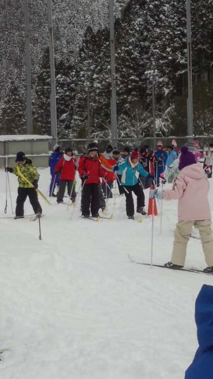 午後からの歩くスキーを始めています。板を履くのに一苦労しましたが,がんばって歩いています。まずグランドを回りました。