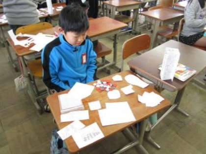 事前に,24日お世話になるお店で扱っておられるであろう商品を紙に用意し,算数セットのお金,520円を使ってお買い物をします。
