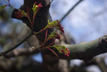 少しも目立ちませんが、「野草」はたくましくひっそりと花を咲かせています。タネツケバナ(春に作物の種をまく前に水につける頃に咲く花)、カエデ(秋の紅葉もきれいですが、今、紅色の花をつけています。新芽の黄緑との色合わせが大変きれいです)、ムラサキケマン(ホトケノザに似ていますがこれはケシの仲間です)など、よく見ると美しいものです。