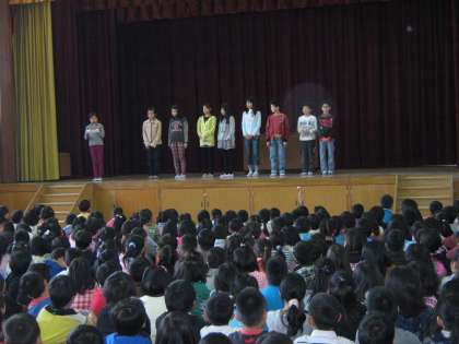 集会では,各学級の代表委員や各委員会の委員長が,全校児童の前で,自分の決意を発表しました。