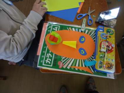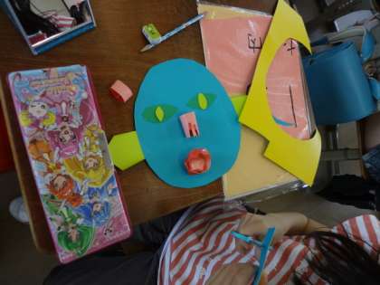 3年図工科では,表裏が違う色の画用紙を使って自分の顔を作っています。