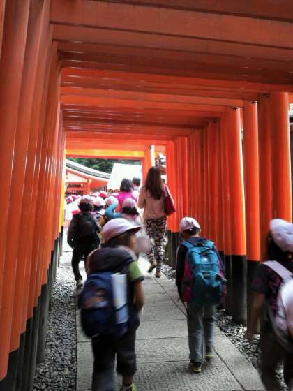 鳥居の数を数えたり,きつねの銅像を見つけたりしながら無事頂上に到着しました。汗をかくほどの暖かい気候のようです。四つ辻から頂上まで登るのが少し大変だったようですが,なかよく声をかけ合って登りきりました。