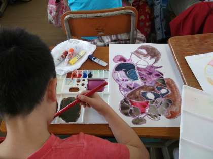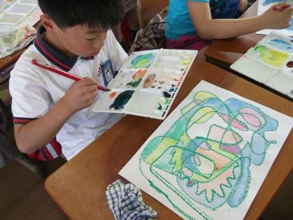 薄い色をぬり,自分の想像する世界になってきているようです。