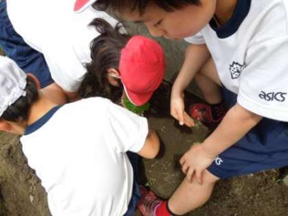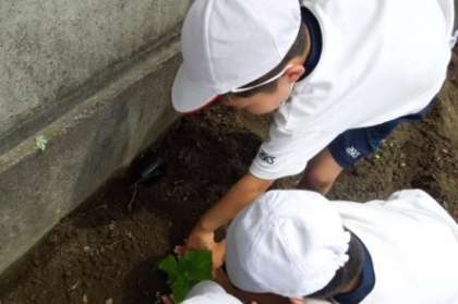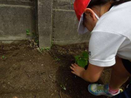 なす,ピーマン,きゅうり,サツマイモの中から自分たちが育ててみたい野菜を選び,みんなの畑に植えました。