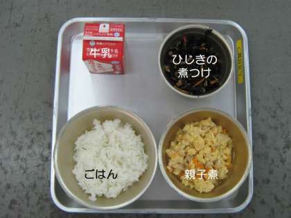 今日の献立は,『親子煮』『ひじきの煮つけ』『ごはん』『牛乳』でした。『親子煮』も『ひじきの煮つけ』も,味付けよくおいしくいただけました。