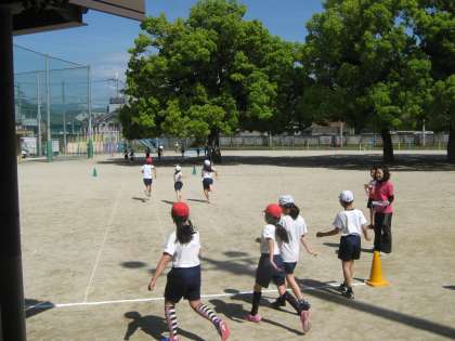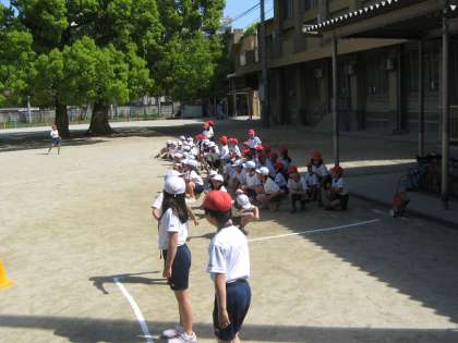 みんなで体をほぐした後,50m走の走る練習をして,最後にタイムを計りました。