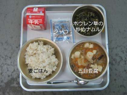 今日の献立は,『五目豆腐』『ホウレン草の炒めナムル』『麦ごはん』『ジャコ』『牛乳』です。
