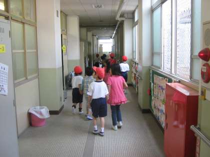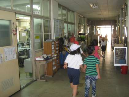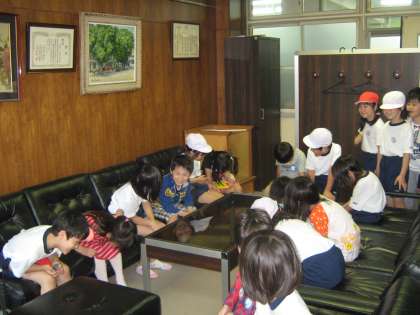 今日の3時間目に1組の子どもたちは,1年1組の子どもたちを連れて,『学校あんない』をしました。2年生の子どもたちは,「ろうかははしらない」などのルールやいろいろな教室・学校にあるものなどを案内したり紹介したりしました。1年生がわからないことを質問されて少し困ったような表情をしている子もいました。校長室へ来て,校長先生のお仕事や校長室の紹介をしている子もいました。