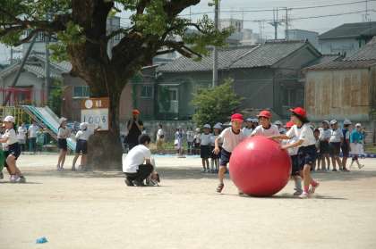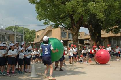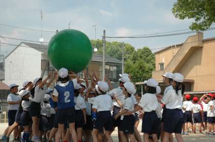 高学年の子どもたちのかけ声に合わせて,各色で協力して大玉を送りました。