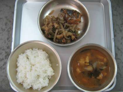 和(なごみ)献立が始まりました。季節においしい野菜や地元の食べ物を使った一汁二菜の献立です。今回は,万願寺とうがらしやみょうが,京北みそなどが使われています。グラタンやハンバーグもおいしいのですが,日本に昔から伝わる味を感じながらいただきました。