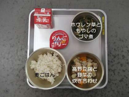 今日の献立は,『高野豆腐と野菜の炊き合わせ』『ホウレン草ともやしのゴマ煮』『麦ごはん』『リンゴゼリー』『牛乳』です。