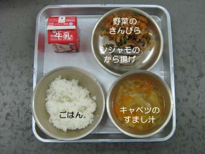今日の献立は,『キャベツのすまし汁』『シシャモのから揚げ』『野菜のきんぴら』『ごはん』『牛乳』です。