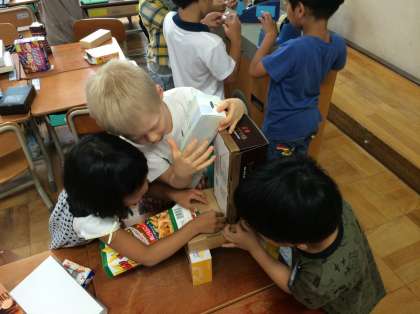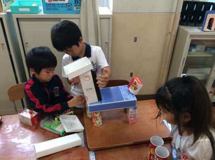 みんなで集めてきた箱を使って自分たちの好きなものを作りました。