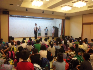旅館の大広間で退館式をし,お世話になった方々にお礼を伝えました。