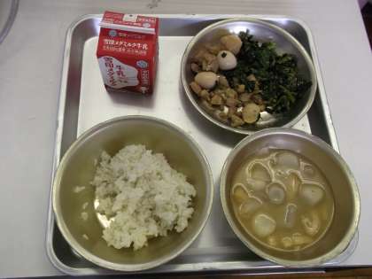 献立は,「いものこじる」「けいにくのさっぱりに」「ほうれんそうのごまに」「むぎごはん」「ぎゅうにゅう」です。