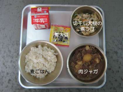 今日の献立は,『肉ジャガ』『切干し大根の煮つけ』『麦ごはん』『黒大豆』『牛乳』です。