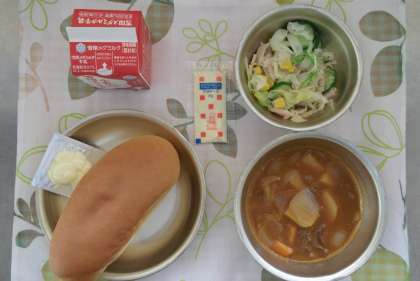 今日の給食は,トマトシチュー,ハムサンドの具,コッペパン,牛乳,かたチーズ、マヨネーズです。