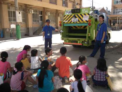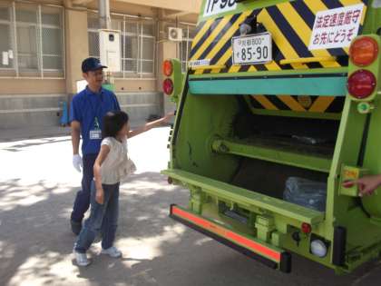 子どもたちは,家から持ってきたゴミ袋を投げ入れ,車のスイッチを押してパッカー車の奥に押し込む操作をさせてもらいました。