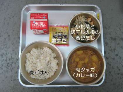 今日の献立は,『肉ジャガ(カレー味)』『小松菜と岐路母子大根の煮びたし』『黒大豆』『麦ごはん』『牛乳』です。