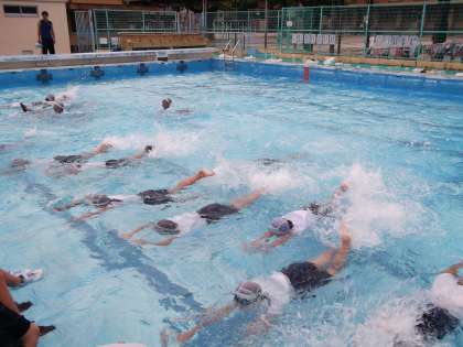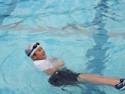 まずは,服をきたまま水の中に入ります。「服がまとわりついて気持ち悪い」「服が重い」といった声があがります。そこでパニックにならず,落ち着いて,浮かぶためにどうするかを考えることが大切。