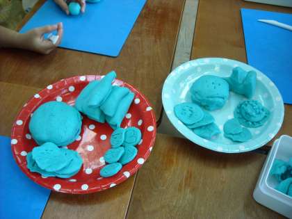 パーティー開始の時間を設定し,その時間までに班で協力しながら,お皿いっぱいにごちそうを作りました。餃子やステーキ,お寿司にケーキなど,自分の好きな食べ物を本物そっくりに作ることができました。