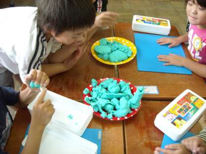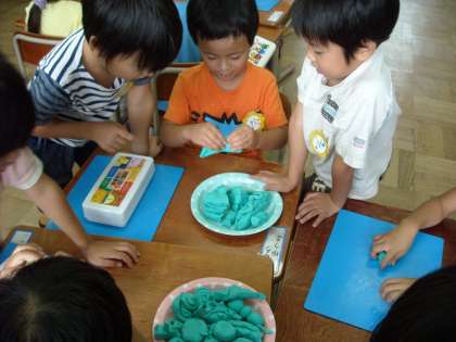 図工「ごちそうパーティーをしよう」では,いろいろな食べ物の形を思い浮かべて,粘土を丸めたり,つまんだりしながら,ごちそう作りをしました。