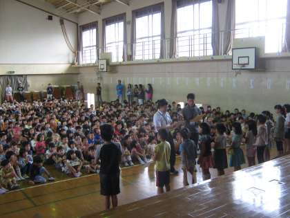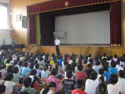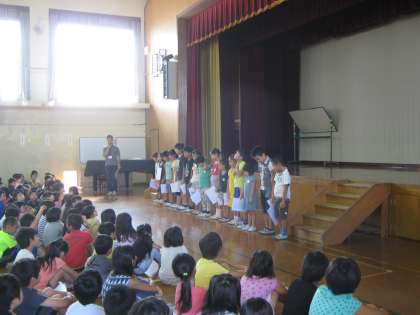 ビオトープの池の鯉についての話を通して,「まわりの人の気持ちを考えて行動できる人になりましょう」との話がありました。そのあと,絵画や書写の奨励賞や特選,入選の表彰をしました。