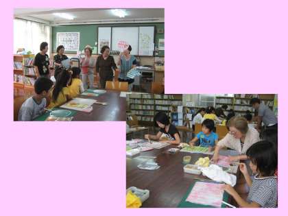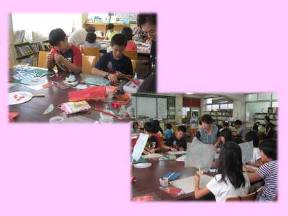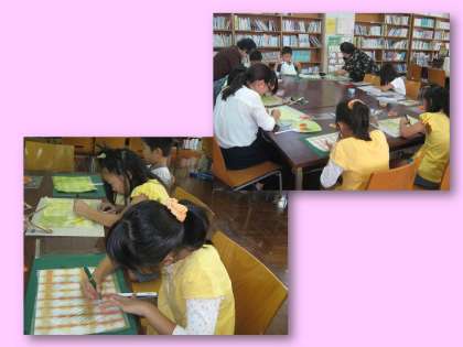今日の午前中,地域のちぎり絵サークルの皆様方にお世話になり,3年生以上の児童を対象に土曜学習を実施しました。内容は,「ちぎり絵でうちわを作ろう」です。