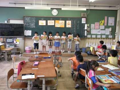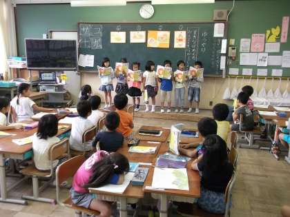 『ゆうやけ』という教材を使って,これまで勉強してきたことをもとに,グループごとに工夫して音読発表会をしました。