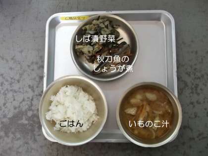 今日の献立は,『いものこ汁』『しば漬野菜』『秋刀魚のしょうが煮』『ごはん』です。今日は,『和(なごみ)給食』で,『和食』を中心にした献立です。