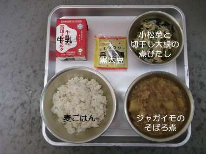 今日の献立は,『ジャガイモのそぼろ煮』『小松菜と切干し大根の煮びたし』『黒大豆』『麦ごはん』『牛乳』です。