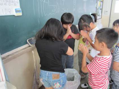 でも,2年1組では,ゴミをゴミ箱に『拝みながら』捨てます。