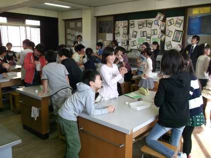 6時間目に1組では,理科室で『流れる水のはたらき』の単元で,川の上流・中流・下流での河原の石の形の違いに着目して,なぜこのような形になるのかを考えて,モデル実験で確かめる勉強をしました。