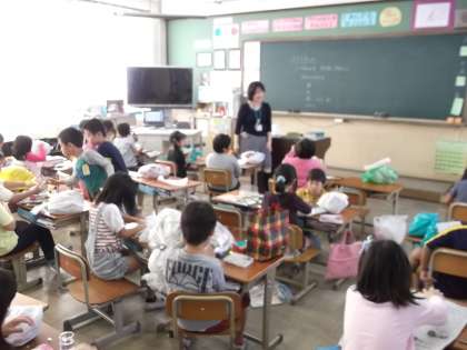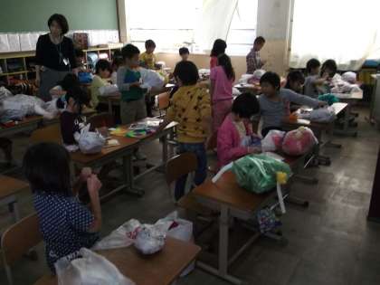 5時間目に1組では,図画工作科の学習で『ふくろちゃん』というテーマで,ビニル袋を使った工作をしていました。