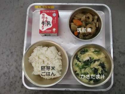 今日の献立は,『かきたま汁』『筑前煮』『胚芽米ごはん』『牛乳』です。
