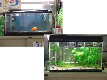 職員室前の水槽がまた一つ増えました。