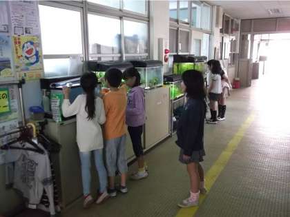 朝からたくさんの子どもたちが,職員室前の水槽のところに集まって,観察しています。新しく加わったお魚を楽しそうに見ていたり,これまでいるお魚にエサをやってうれしそうにしていたりしています。子どもたちにとっては,憩いの場所になってきたようです。職員室前が,少しずつ『水族館』ぽくなってきているのは,とてもうれしいことです。