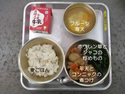 今日の献立は,『平天とコンニャクの煮つけ』『ホウレン草とジャコの炒めもの』『フルーツ寒天』『麦ごはん』『牛乳』です。