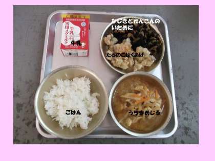 今日の給食は,「牛乳」「ごはん」「たらのこはくあげ」「ひじきとれんこんのいために」「うちまめじる」です。