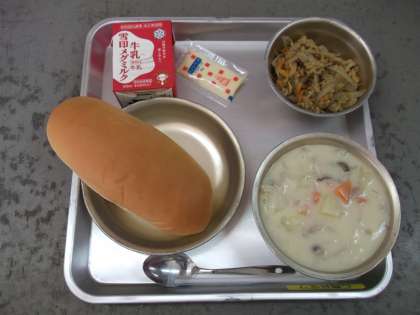 今日のきのこのクリームシチューには,エリンギとしめじが使われていました。きのこは秋においしい食べ物です。しいたけやしめじ,えのきだけなどはご家庭でもよく使われるきのこですね。最近はテレビのCMなどでも有名になっているまいたけもきのこの仲間です。