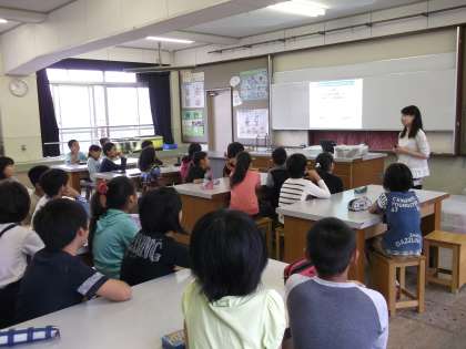 太陽電池の効果や,太陽電池の製造方法を教えていただきました。そして,太陽電池で動くおもちゃを動かして遊びました。子どもたちは,光の当て方をいろいろと工夫して,おもちゃの動き方の変化を確かめていました。最後に,地球のために自分にできることを考えて発表しました。実際の企業の方に話を聞くことは,子どもたちにとってとても新鮮で,よい学習になったのではないかと思います。