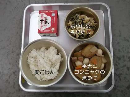 今日の献立は,『平天とコンニャクの煮つけ』『もやしの煮びたし』『麦ごはん』『牛乳』です。