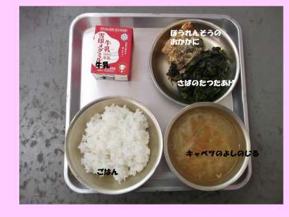 今日の給食の献立は,「牛乳」「ごはん」「さばのたつたあげ」「ほうれんそうのおかかに」「キャベツのよしのじる」でした。