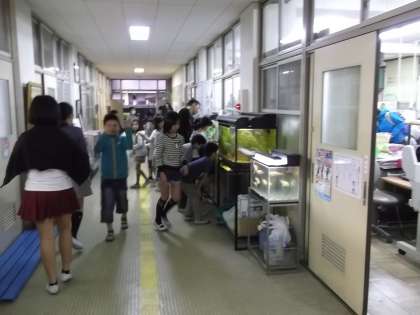 職員室前の水槽のところにたくさんの子どもたちが集まって,魚を観察したり,エサをやったりしていました。