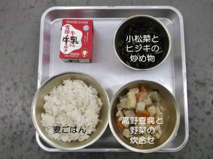 今日の献立は,『高野豆腐と野菜の炊合せ』『小松菜とヒジキの炒め物』『麦ごはん』『牛乳』です。